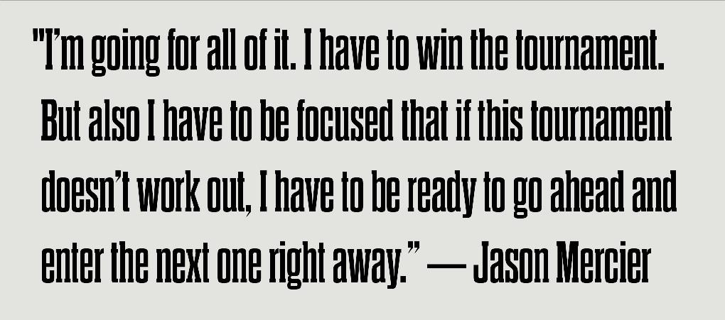 "In some of these tournaments, first place is like $150,000 and second is [$80,000]," Mercier says. "Well, for me, as I’m approaching the third bracelet, first place is like $2.5 million and second is still only [$80,000]. So I’m applying a much different style. I’m going for all of it. I have to win the tournament. But also I have to be focused that if this tournament doesn’t work out, I have to be ready to go ahead and enter the next one right away."