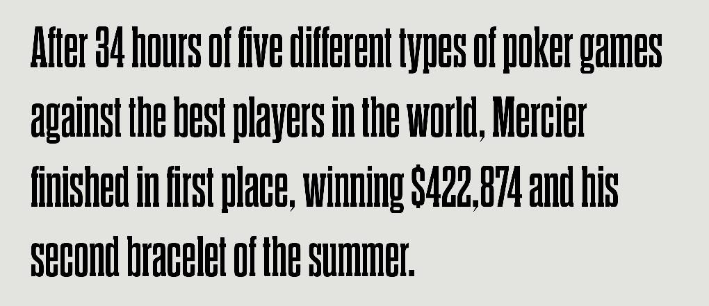 He went back to the Rio after dinner and entered the event right as registration was closing. Three days later, after 34 hours of five different types of poker games against the best players in the world, Mercier finished in first place, winning $422,874 and his second bracelet of the summer.