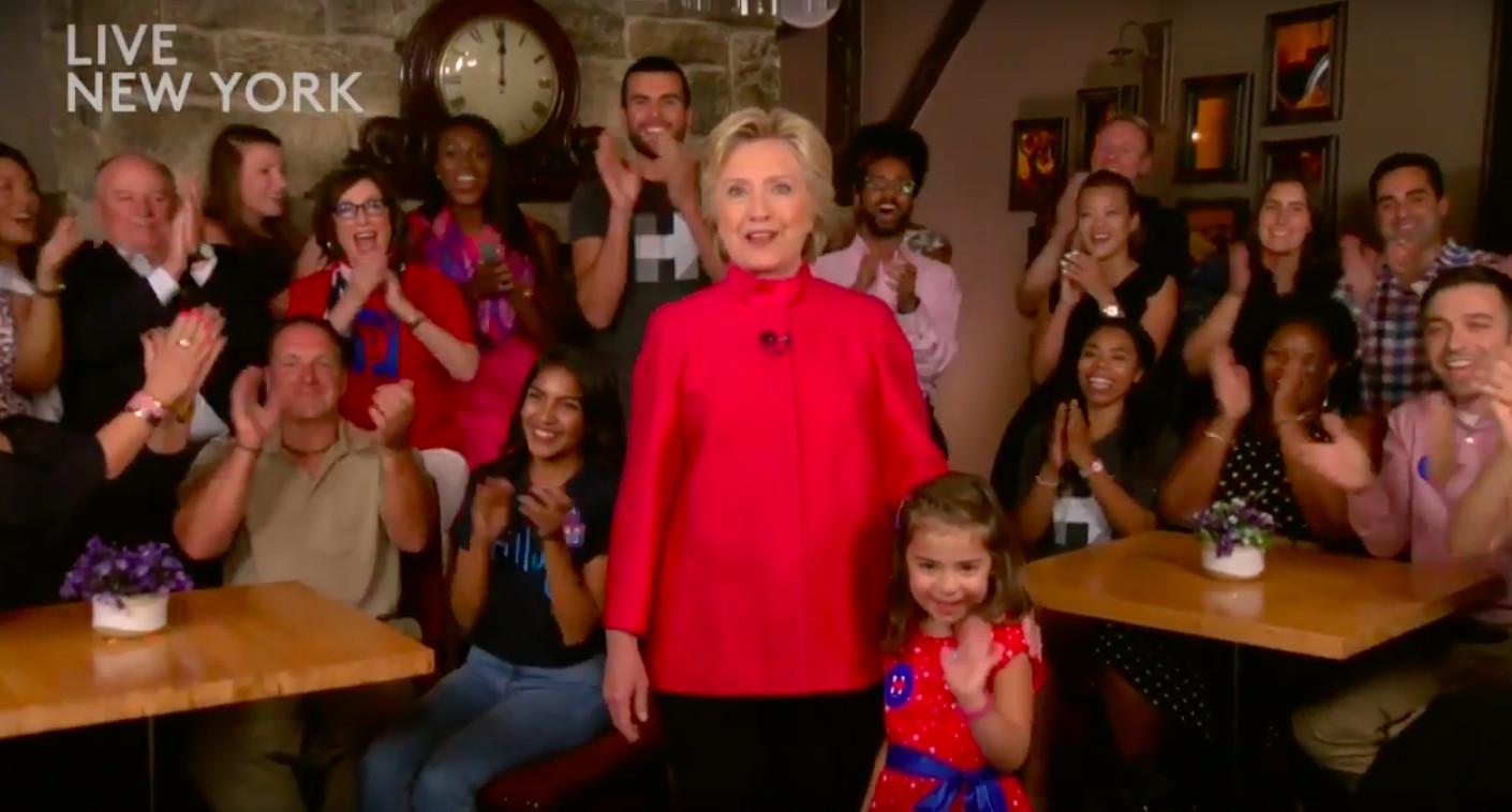 Clinton addressed the Wells Fargo Center just after 11 p.m. Eastern. This video was made to seem as if it were live: After bursting through a montage of former (and soon-to-be-former) presidents, Clinton paused to wait (supposedly) for applause to die down, and then commented on what a great day and night (and night!) it had been. The word “live” appeared in the corner. The people around her — young and old — looked into the camera and cheered, overjoyed (supposedly) with the Democratic Party’s support and Clinton’s husband’s ability to not completely fuck up everything.