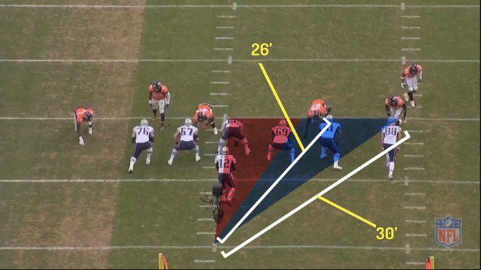 The distance between the hash marks is 18 feet and six inches. Jackson is positioned about 10 feet from where the ball is being snapped. Miller is all the way on the far hash, about eight additional feet outside. After taking the shotgun snap, Tom Brady will retreat three yards, ending his drop about eight yards behind the original line of scrimmage. By busting out the Pythagorean theorem — which I think I still know how to use — we find that the shortest distance to Brady is four feet shorter for Jackson (26 feet) than it is for Miller (30 feet). That may not seem like much, but working within the time frame of a standard NFL dropback, it can make all the difference.