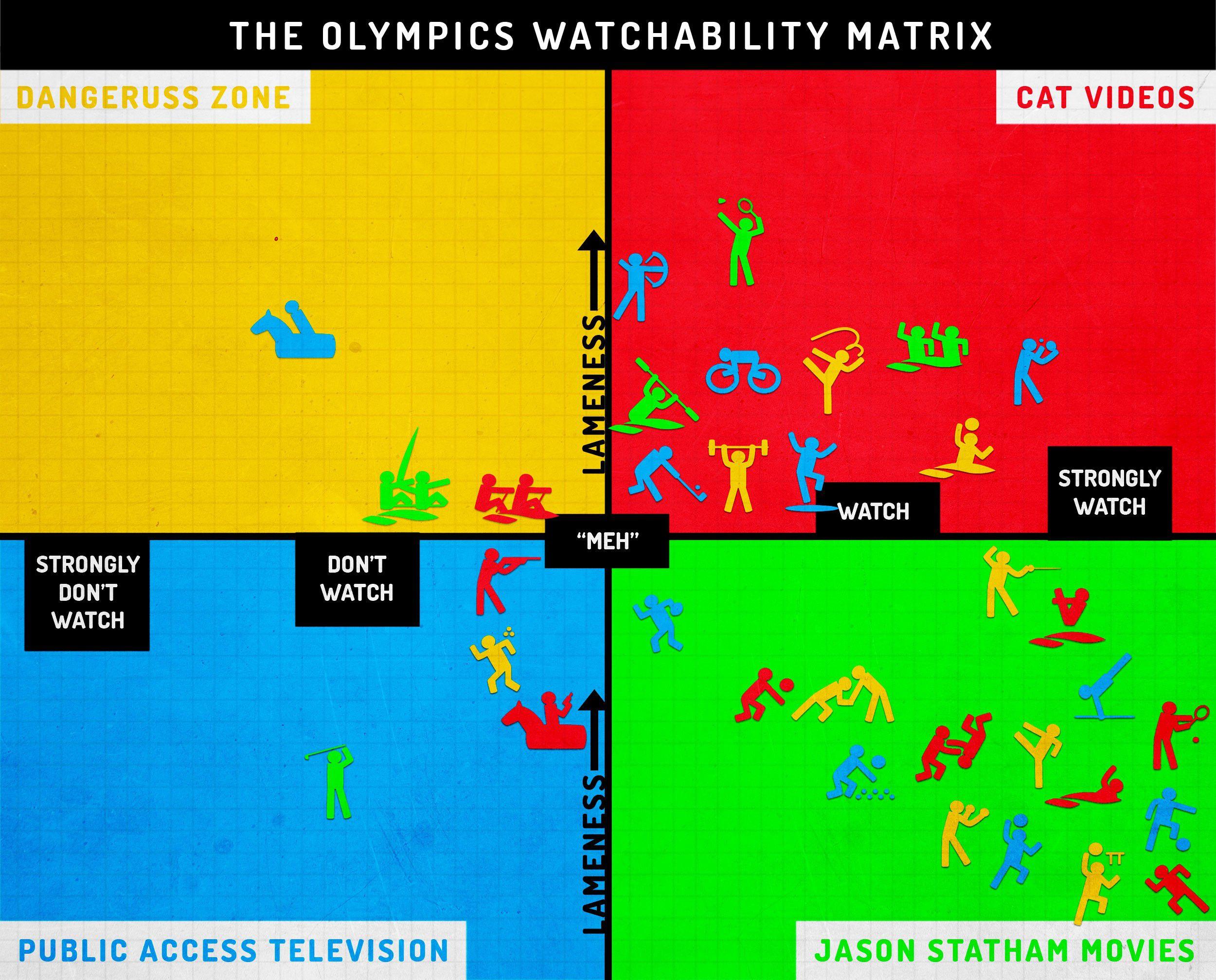 And so, we’ll be dispassionately placing all 34 Olympic sports on a scatter plot for all posterity. Welcome to the Olympics Watchability Matrix.