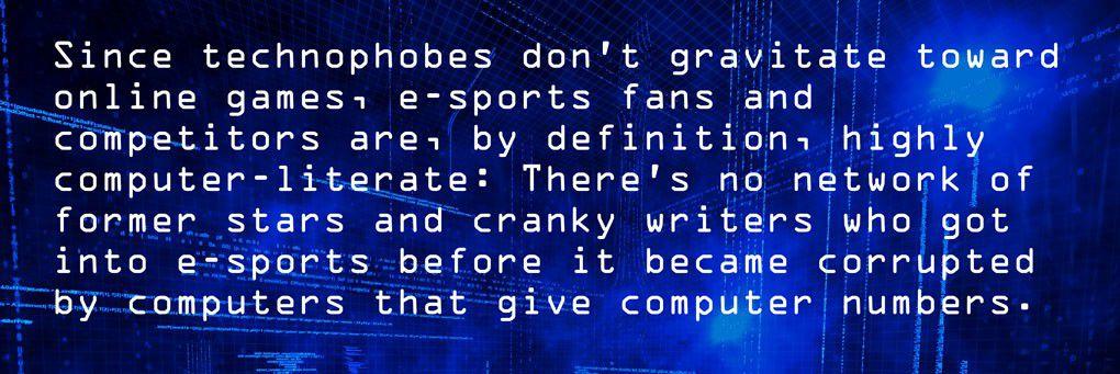 Since technophobes don’t gravitate toward online games, e-sports fans and competitors are, by definition, highly computer-literate: There’s no network of former stars and cranky writers who got into e-sports before it became corrupted by computers that give computer numbers. In baseball, hot-takers still accuse sabermetrics of sapping some of the sport’s beauty or mystery, reducing the divine to soulless lines of code. Code makes MOBAs exist. And the community’s players and coaches are almost universally young, which means most of them aren’t entrenched enough for their attitudes about the proper way to play to have hardened with age. "I’m probably one of the older people, in terms of how long I’ve been doing e-sports statistics," says Herren, who’s 25. "And when I say one of the older people, I’ve been doing it for three years."