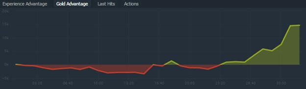 Using this time-stamped information, sites such as Dotabuff can generate displays like this one, which shows the minute-by-minute gap in gold between Team Secret (red) and the victorious Vega Squadron (green) in the last third of their decisive match at ESL One New York. The Gordon Gekkoesque takeaway: Gold is good.