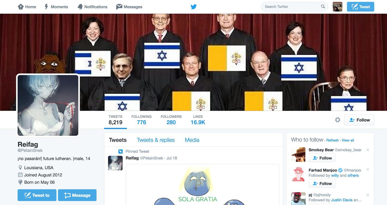 Early this year, The New Republic senior editor Jeet Heer similarly noted the odd, online prominence of “racist anime fans.” But what might seem like a broad contingent of anime-obsessive trolls is actually a bit more nuanced. Look closely and you’ll see that the most commonly adopted avatars are cartoon girls whose passiveness or adorable radiance contradicts the cruel language and intentions of the users who co-opt their aesthetic. One of the first users to target Kreizman has worn a variety of anime avatars since first harassing the author in July. Before @PetainSnek deleted his account earlier this week (and possibly started a new one), the user’s avatar was a fan art drawing of the Neon Genesis Evangelion character Rei Ayanami, the archetype for an anime character style known as moe.