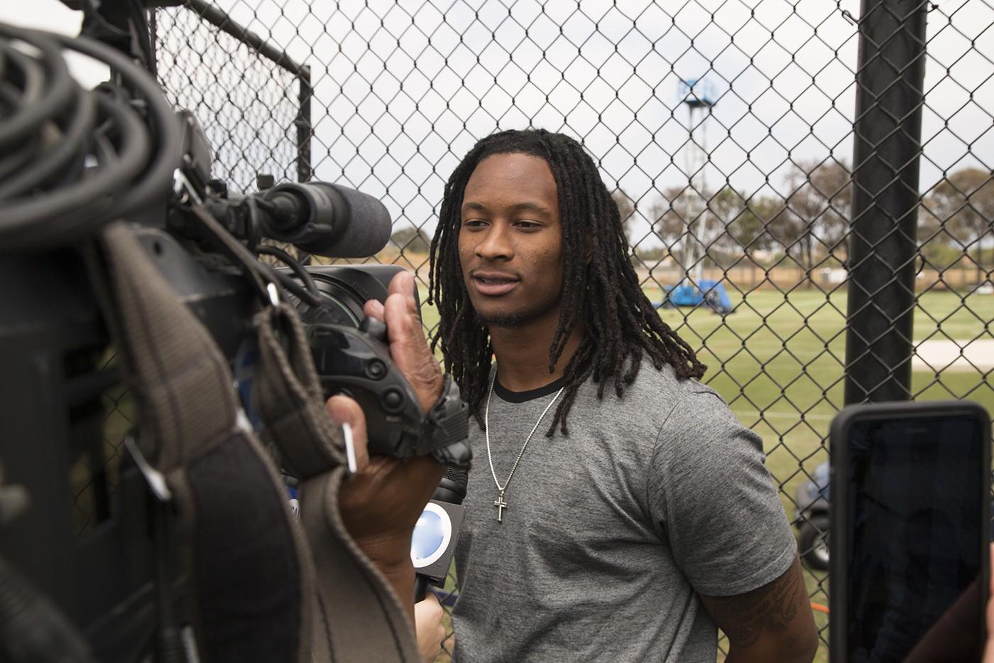 Cut to Fisher coolly observing some footwork drills, then to our runner scampering along the Hollywood Walk of Fame. A Jared Goff billboard hangs overhead, but he’s moving, sort of like a painting in Harry Potter. The runner travels through Beverly Hills and makes his way up to the Hollywood sign, and dramatically reveals himself to be Gurley. Get your popcorn — and In-N-Out Double-Doubles — ready.