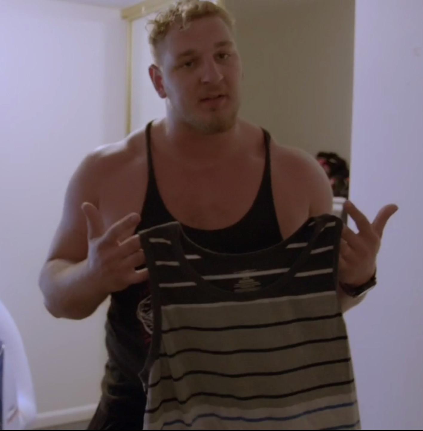 After an auspicious introduction, Rams center Eric Kush delivered on his promise in the season premiere by treating viewers to a guided tour of his extensive tank-top collection. The fourth-year lineman boasts a tank for every occasion, establishing a clear distinction between going-out tanks, workout tanks, classic Gold’s Gym tanks, patriotic tanks, “stringer tanks” (no idea), and “not too much, nice” tanks (for when he’s “trying to show off the arms, but not be too much about it”). According to Kush, who also brought enough socks to avoid ever having to wash a pair, tank tops are “the most important part about training camp,” and who are we to disagree?