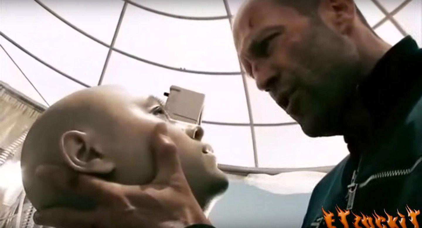 Since the head isn’t floating in the watery goop anymore, it mumbles out that it needs water. Statham asks, “Water? Did you say water?” Then he spits in the head’s face, as if that’s the kind of water the head wanted, or needed. The head mumbles some curse words, then Statham says, “H2O coming right up,” then he yanks the cords out of the head’s neck and super-punts the head into a nearby pool. The head dies.