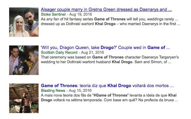On a day-to-day basis, Khal Drogo’s 300–500 PPD is surprisingly stable. This is especially impressive, considering Drogo has been dead for five full seasons. Further research is needed, but, at the moment, Drogo’s staying power appears to stem from GoT fans’ predilection for cosplay nuptials (see above picture); the speculative nature of the fan culture surrounding the books and show; and the constant rumors that the character will return as either a flashback or in fully resurrected form. Just this week, in fact, actor Jason Momoa was spotted partying in Belfast with showrunners David Benioff and D.B. Weiss.