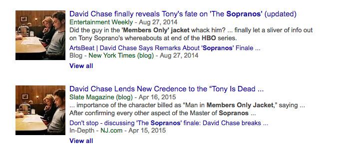 Every once in a while, Sopranos creator David Chase gets interviewed and invariably is asked about the fate of Tony Soprano and the role Members Only Jacket Man played therein. This explains MOJM’s enviable CUPS score and continuing place in our cultural consciousness.