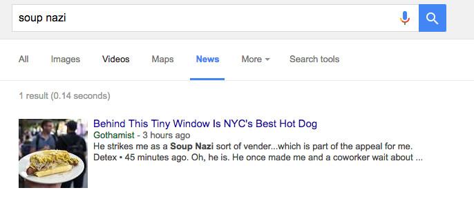 Twenty years later, and the Soup Nazi’s mere six scenes still resonate. This is especially true in the burgeoning food-blog space, where references to the S.N. are understood to impart hard-to-identify ethnic authenticity, deliciousness, and a dash of acceptable fascism. An amazing achievement.