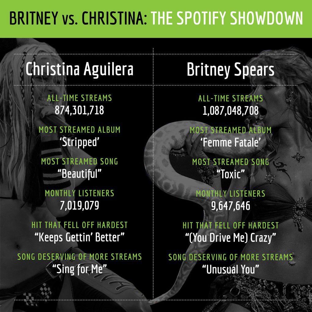 Point is, even though their discographies and career arcs are wildly different, Britney and Christina are stuck together in the pop-culture pantheon. But whose music is resonating with listeners 17 years later? Spotify, the envelope please.