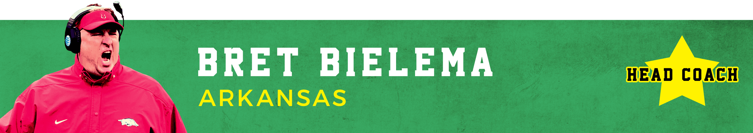 Bielema is known for revitalizing mid-level Power 5 programs. Wisconsin was a good job when he took over for Barry Alvarez in 2006, but after his teams won three straight conference titles, it became one of the most respected programs in the Big Ten. It was shocking when he left Wisconsin for Arkansas — what many saw as a lateral career move — but his work with the Badgers was done. His current project presents an even greater challenge: bringing the Razorbacks to a position of strength in an SEC West division that houses Alabama, LSU, Ole Miss, and Auburn (to name a few). His teams have progressed with each season, and they still have a long way to go, but we can count on Bielema to keep his face in the press and his cell phone provider in business while the Razorbacks aim for that elusive SEC title.