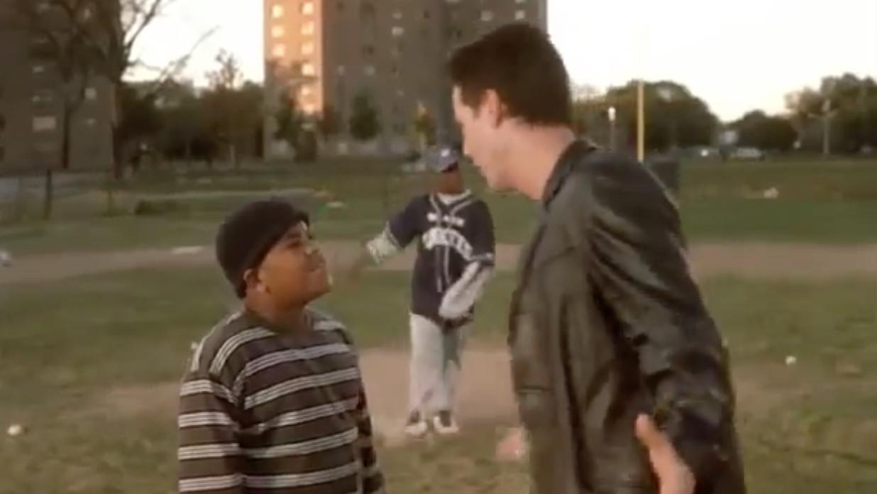 He gets to his car, turns around, charges back at the kids, then tells them all to shut up because he’s done listening to them, and done listening to everyone else, too. He asks them if they have ever been to a big league game. They tell him no. He makes fun of them for being so poor and underprivileged. Then he takes them to a game.
