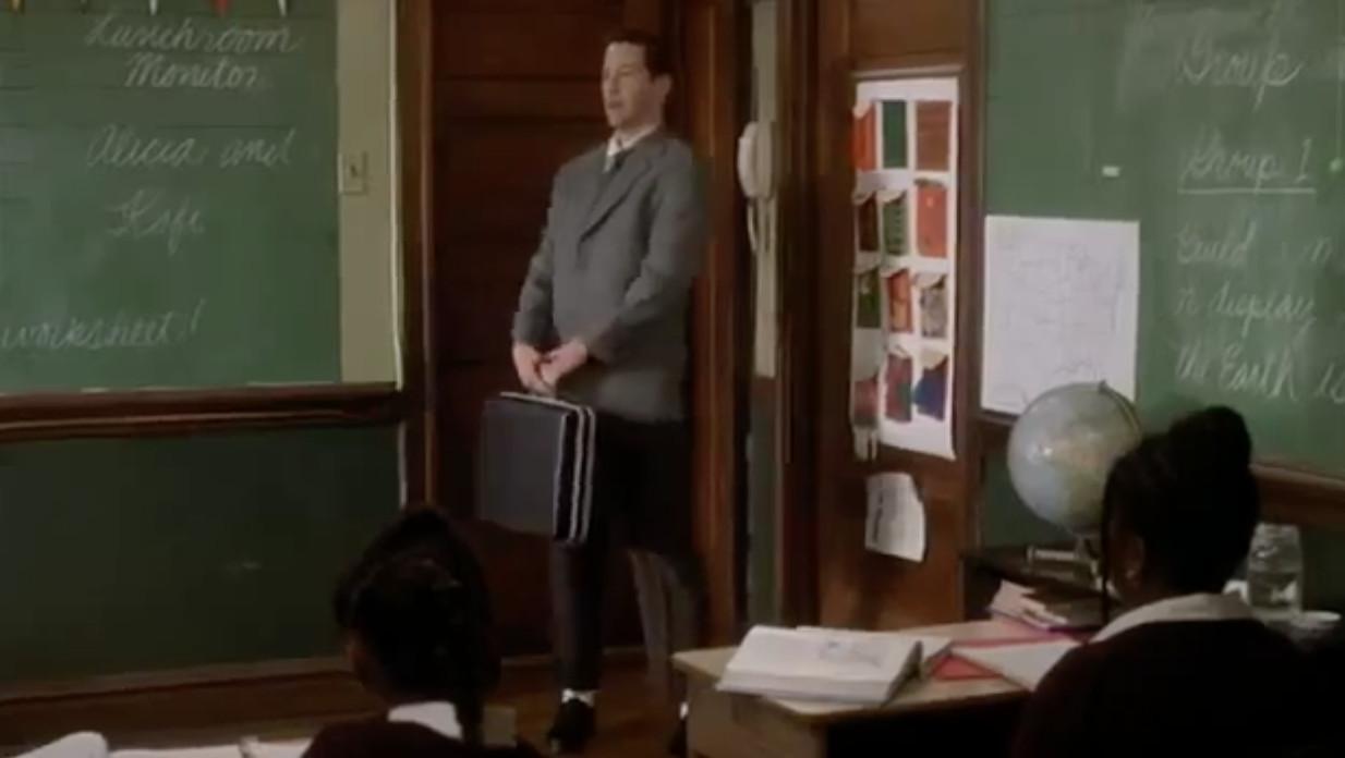 Conor shows up to the kids’ school and sits in on one of their classes. He wears a tie and also he opens a briefcase from the wrong side and all its contents spill out onto the floor. Everyone laughs.