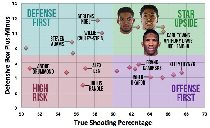 There is, however, a give-and-take with specialists that teams have to account for; their strengths often come packaged with significant weaknesses. From a skills standpoint, the Sixers won’t be dealing with that kind of give-and-take with Embiid. He checks all the boxes as a supreme-level prospect on the same level of Karl-Anthony Towns and Anthony Davis. There have been 20 college big men drafted in the NBA lottery over the past five years; when charting their college production by way of true shooting percentage (to account for their scoring efficiency) and defensive box plus-minus (an estimated metric that measures points contributed, similar to PER or win shares) the results reveal some interesting clustering within the four quadrants: