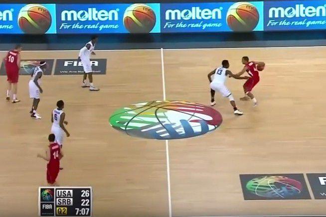 Teams can put him in unique situations knowing he has the agility to keep up anywhere on the court. During the second quarter of the Serbia game, U.S. head coach Don Showalter had the team running a 1–3–1 zone press to change things a bit. It’s fairly typical to see the small forward take the role of chasing the point guard. In this case, it was the 6-foot-10 Giles at the tip of the spear, completely engulfing 6-foot-5 Stefan Peno, Serbia’s starting point guard: