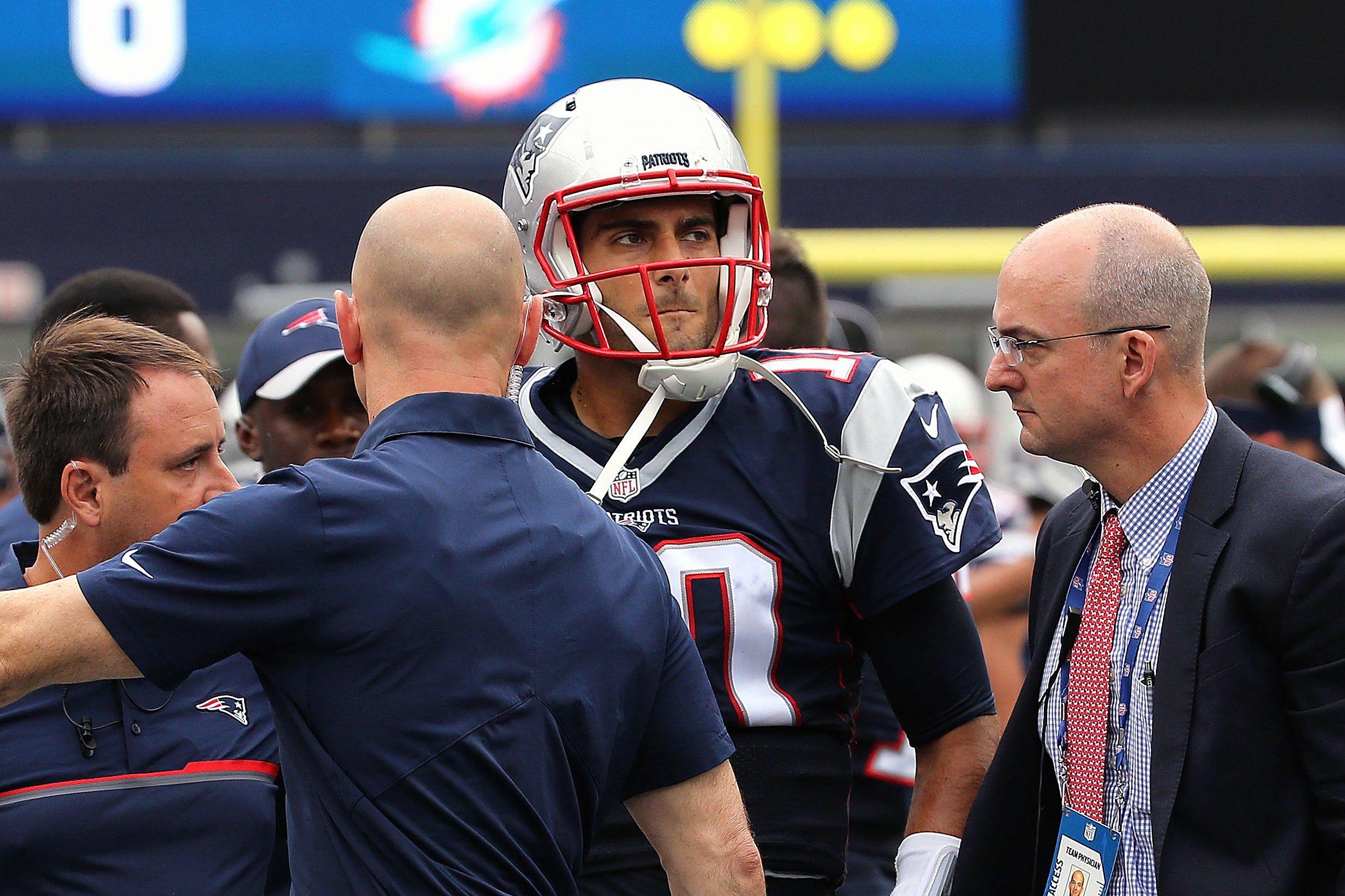 1. The initial reports on Patriots quarterback Jimmy Garoppolo are that he sprained the AC joint in his throwing shoulder after being driven to the turf by Dolphins linebacker Kiko Alonso late in the second quarter of New England’s 31–24 win.