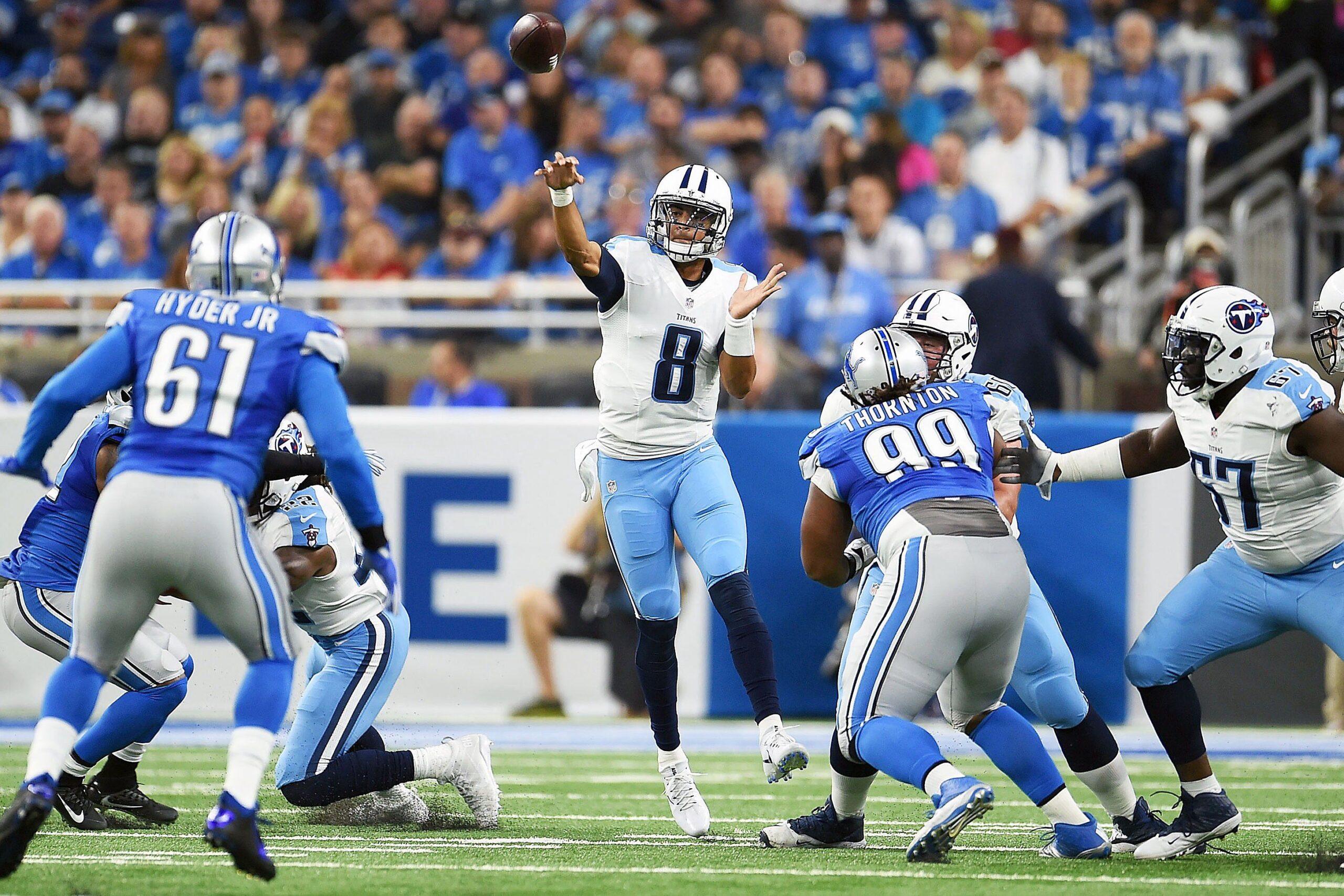 Already without starting linebacker DeAndre Levy, Detroit lost both Antwione Williams (thigh) and Kyle Van Noy (calf). By the fourth quarter, the Lions were playing backup defensive end Brandon Copeland at linebacker, and Marcus Mariota took advantage. The three most crucial throws of the game for Tennessee’s quarterback — a 30-yard, fourth-quarter touchdown to Delanie Walker; a 22-yard strike to DeMarco Murray with 3:05 left in regulation; and the game-winning touchdown toss to Andre Johnson — all came on throws up the seam that exploited Detroit’s problems in the middle of the field.