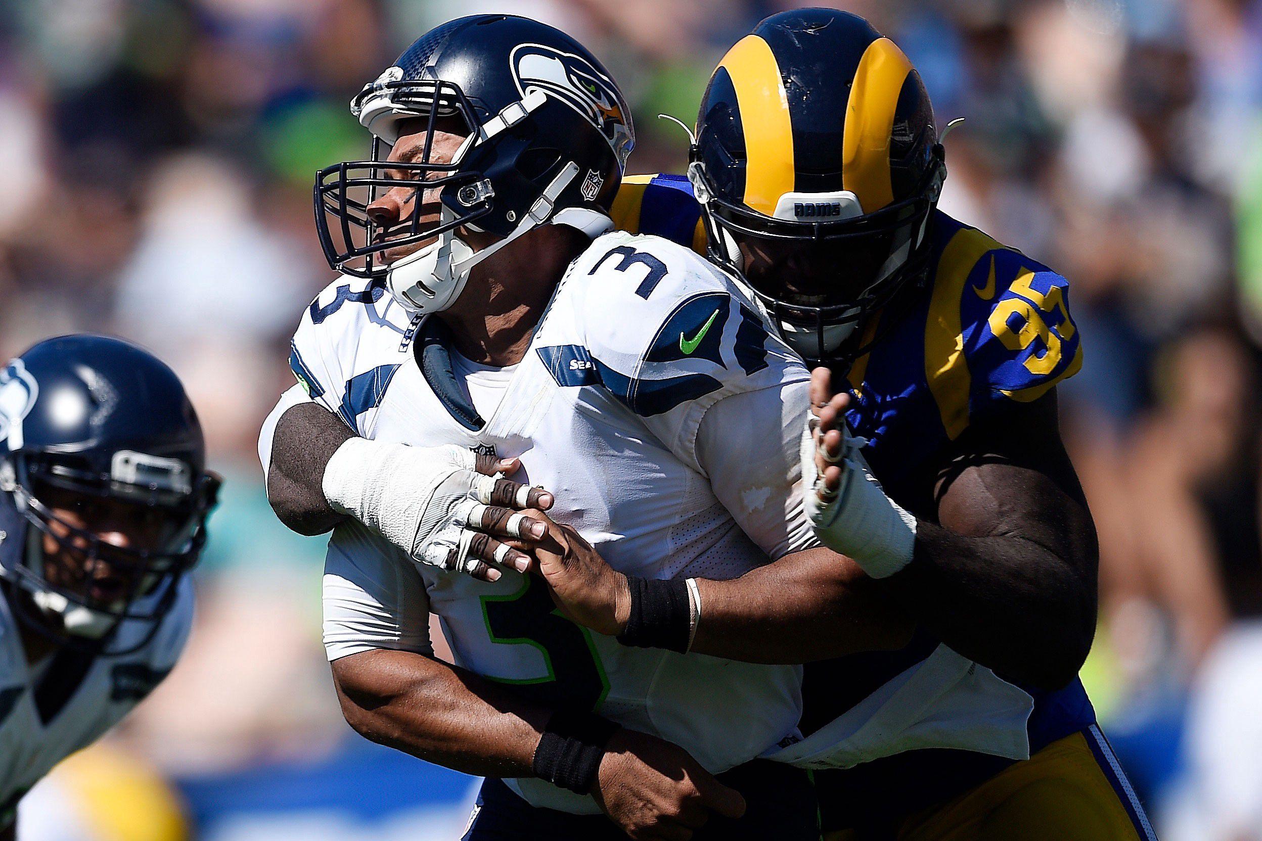 In the team’s first regular-season game in its temporary new home at the Coliseum, Los Angeles’s front four eviscerated the Seahawks’ offensive line as part of a 9–3 victory. Already hobbled with an ankle sprain suffered on a sack from the Dolphins’ Ndamukong Suh in Week 1, Wilson was sacked twice more (Robert Quinn got to Wilson a third time, but the play was negated by offsetting penalties) and hit nine times in total. Aaron Donald laid waste to Seattle’s guards; Quinn, meanwhile, will likely haunt the dreams of Seahawks left tackle Bradley Sowell for a while.