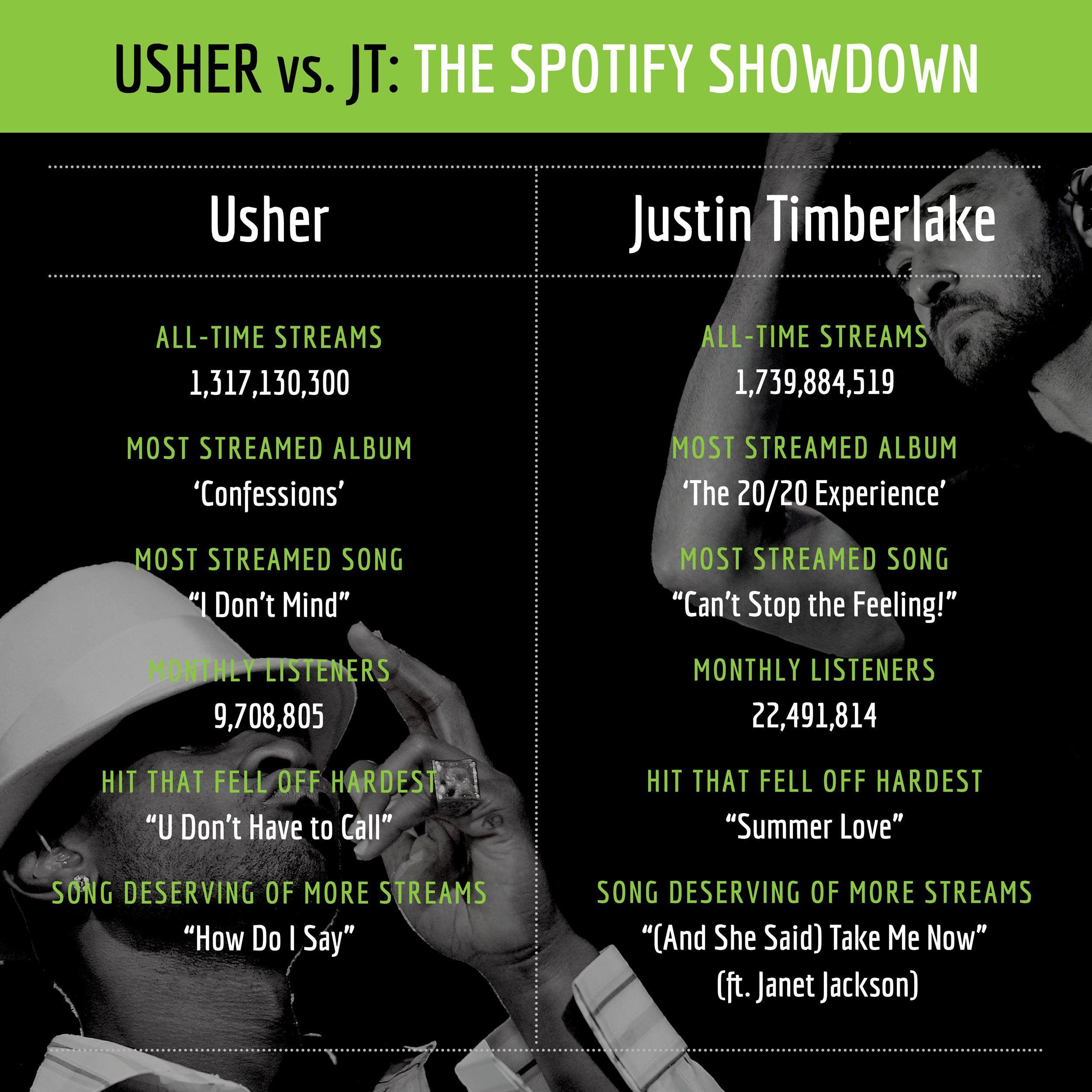 In the 1990s, a pair of Southern boys rose to singing stardom. One was an R&B crooner from Atlanta by way of Chattanooga. The other was a bubblegum pop star from Memphis. Eventually they’d meet in the pop-R&B middle with a pair of the definitive albums of the 2000s — Usher’s Confessions in 2004 and Justin Timberlake’s FutureSex/LoveSounds in 2006. These two men have both been releasing music for two decades and wowing audiences with their dance moves for just as long. They’ve both gone diamond. And they’ve both knelt at the throne of the King. But who’s the more popular artist in 2016? Spotify’s got the stats.
