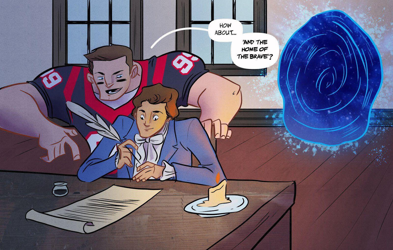 “Well, the second-to-last line is, ‘O say, does that star-spangled banner yet wave,’ but that’s it. I’m stuck there. I like everything up until that point. I’m thinking maybe I end with, ‘Liberty is great, I’m glad I’m not in a grave.’ Or maybe, ‘America is cool, right now we have slaves.’ I don’t know. What do you think?”