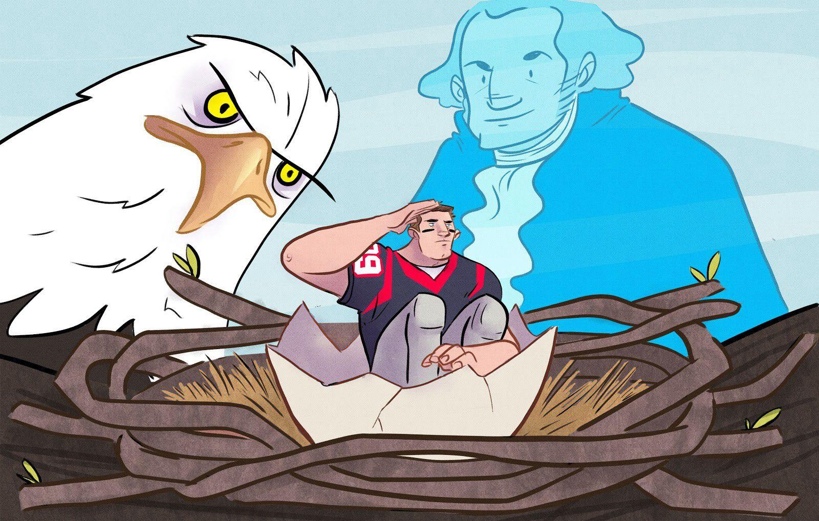 “Hello, J.J., I’m your daddy,” the ghost of George Washington said to J.J. Watt. His giant bald eagle mama leaned in and pecked him gently with her giant bald eagle beak. And J.J. Watt spoke his first words, except they weren’t words at all.