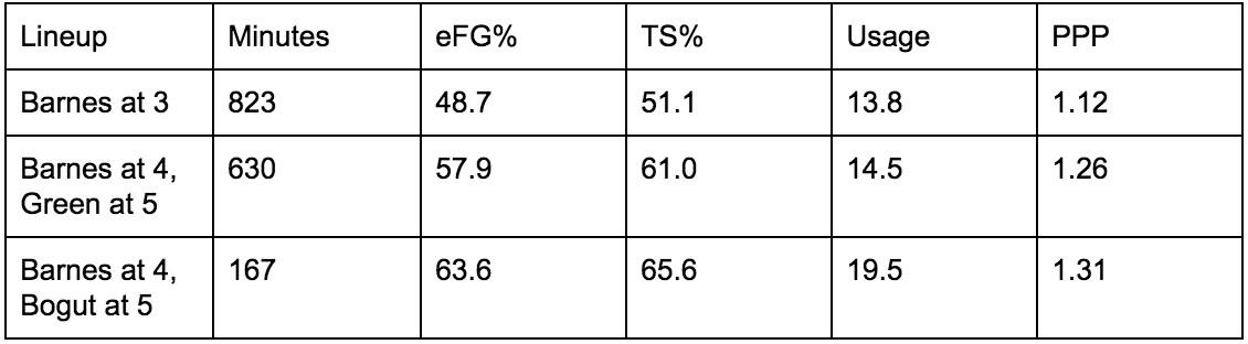 When Barnes was playing in more conventional lineups with Draymond Green at the 4 and Andrew Bogut at the 5, he was an average offensive player. When he was playing at the 4, with either Bogut or Green as the sole big man on the floor, his productivity skyrocketed. Numbers courtesy of NBA Wowy: