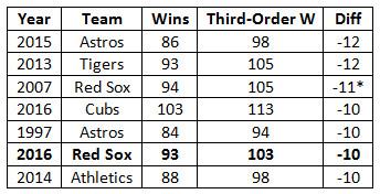 On average, playoff teams in the expansion era (1961–2016) have outplayed their third-order regular-season records by two wins. That makes sense; sometimes, qualifying for the postseason takes a little luck. It’s more common, then, for playoff teams to exceed their third-order records by big margins than it is for them to fall far short. This year’s Red Sox are just one of seven playoff teams in the past 55 years to underperform their third-order records by 10 wins or more. Boston’s been on this list before — and that team won the World Series.