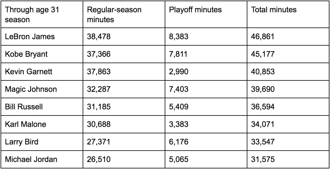 The only players who had a comparable workload at LeBron’s age are Kobe Bryant and Kevin Garnett, who also came into the league directly out of high school and became stars by the age of 20, logging heavy minutes from that point on. After staying healthy for most of their careers, their bodies started to break down by their mid-30s. Garnett tore up his knee at 32, and Kobe tore his Achilles at 34. Both injuries came on noncontact plays. There’s no way to know whether the burden of those minutes caught up to them, or whether they were the victims of freak accidents, but having more than a decade’s worth of wear on their tread couldn’t have helped. LeBron has been an iron man his entire career, but all it takes is one awkward fall to change everything. KG made a relatively full recovery; Kobe was never the same player again.