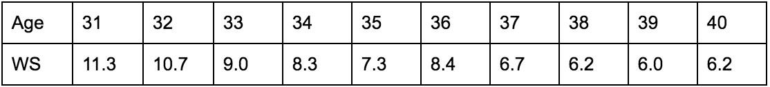 The only instances in which the average WS ascends are from age 35 to 36 and 39 to 40, an effect of what statisticians call survivorship bias. The players prone to injury had mostly dropped out of the pool by that age, leaving behind the relatively healthy still playing at a higher level.