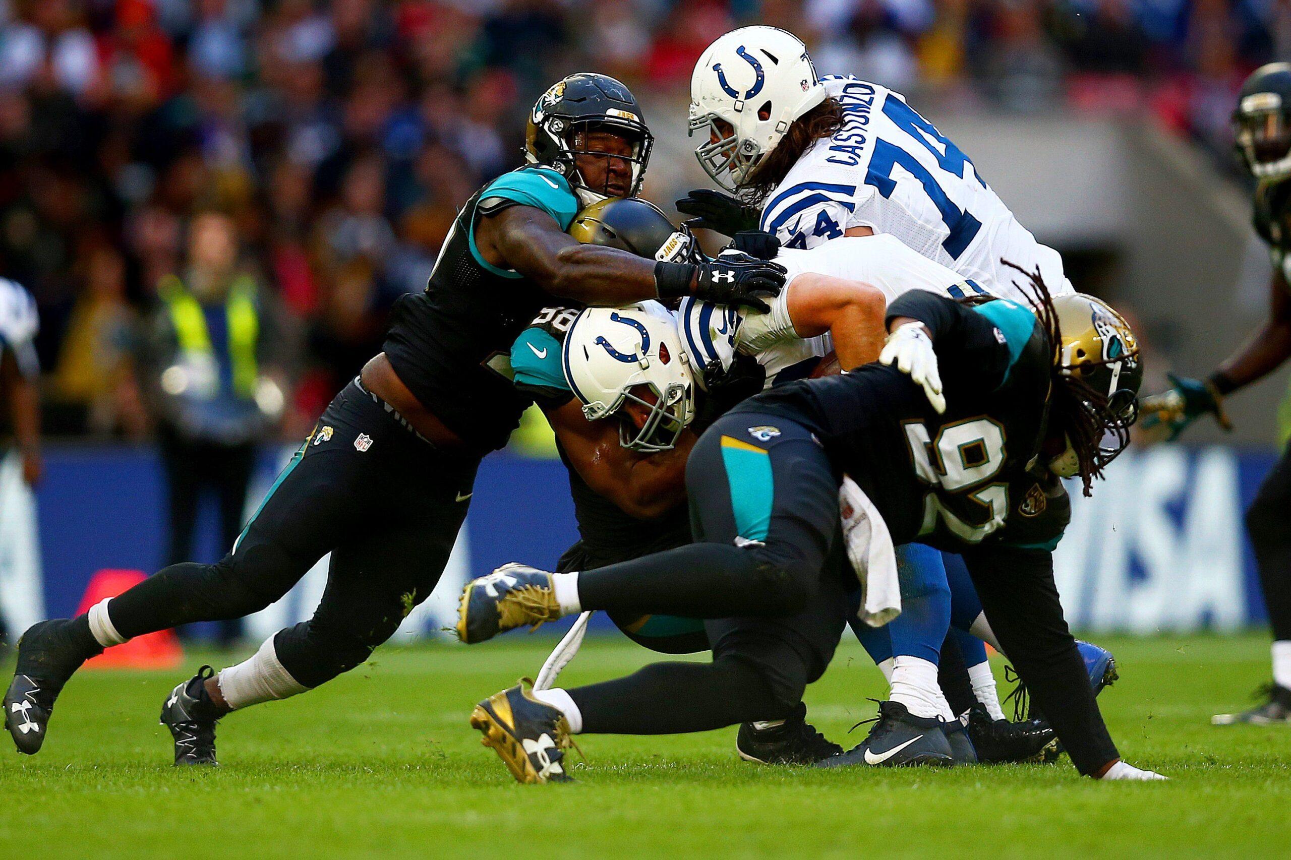 Not awesome: his offensive line. In 2014, The Washington Post detailed the Colts’ inability to protect him. Things failed to improve, and in 2015, analysts were calling his offensive line “an insult to average.” Yet the Colts elected to use veterans who were already on the roster at four of five O-line positions. They selected center Ryan Kelly in the first round, and he’s been decent, but he was also among the players Pro Football Focus said the Jaguars “took apart” last week. And regardless of Kelly’s success, adding one promising body wasn’t nearly enough: The team, already banged up, suffered two injuries to their veterans and resorted to starting a fifth-round pick (Joe Haeg) and a seventh-round pick (Austin Blythe) in their places, leading to Luck being sacked a career-high six times on Sunday against the Jaguars.