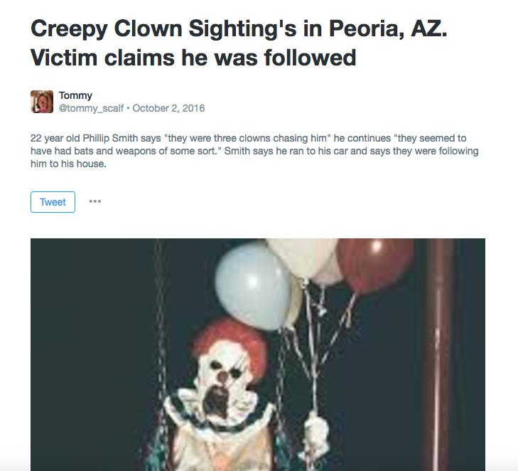 This tweet, referencing a clown chasing someone around Peoria, Arizona, was so popular it was added to a Twitter Moment earlier this week about the incidents. The image in the tweet, however, was a very old one. Google Reverse Image Search (Catfish has made this tool so widely known, I’m shocked this post hasn’t been written elsewhere yet) brings up many past uses of the image, including a 2014 story about a clown terrifying residents of Wasco, California.