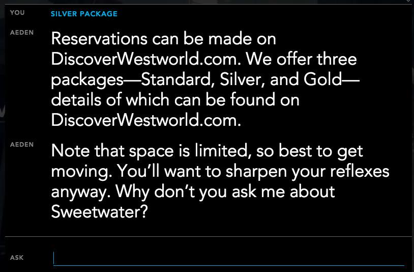 Through two episodes, Westworld has kept our attentions focused on the park, on the machinations (sorry) of the people who keep it going, and on the emerging inner life of the host robots. In “The Original,” a guest mentions that his first visit to the park was in the company of his wife and kids. The Delos ARG has an email thread in which someone in the sales department laments the drop-off in families staying at Westworld. If the society outside of Westworld has come to a point where raping and slaughtering tearful and terrified robots is not just OK, but family entertainment, then I’m more interested in what happened out there.