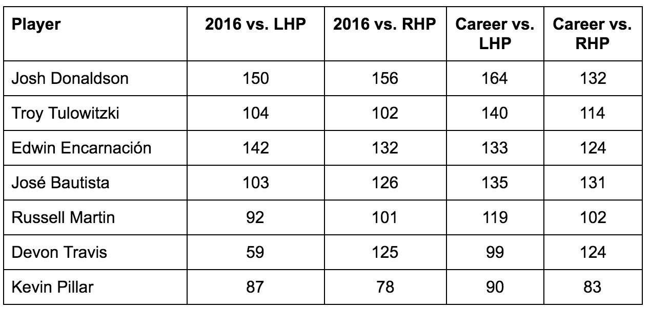 And because the Blue Jays have invested so heavily in established hitters — most notably Josh Donaldson, Troy Tulowitzki, and Russell Martin — they’ve managed to put together a lineup that’s heavily unbalanced on paper, but doesn’t have much trouble with same-handed pitching in practice. Here are the platoon splits (by wRC+) for Toronto’s seven projected right-handed starting position players.