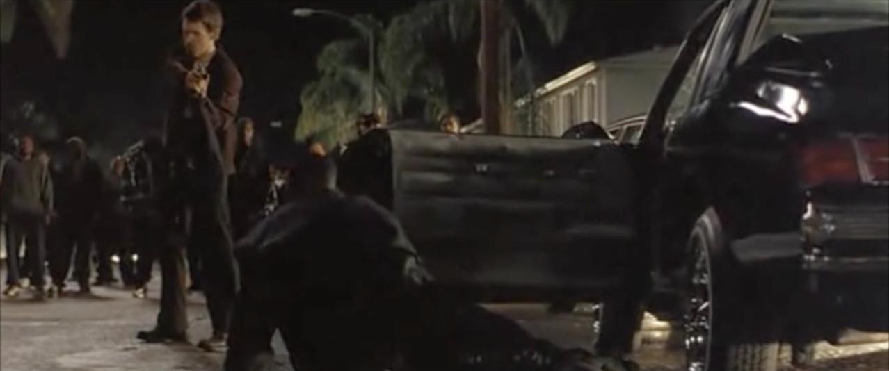 First Bit of Information: Prior to the scene that’s getting fact-checked, Jake and Alonzo got into a massive fight that began with a shootout between the two of them inside of an apartment and ended with Jake diving onto the hood of Alonzo’s car as Alonzo tried to drive away with a bag full of money. Jake caused Alonzo to crash the car, jumped off the hood, punched him in the face a few times, and is now holding him at gunpoint. Jake is so upset because …