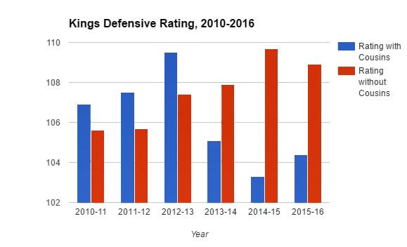 Cousins’s biggest improvement over the last few years has come on the defensive end. He’s capable of anchoring a defense without another traditional big man in the lineup, as he’s become much better at reading the floor from the help side and anticipating what the other team is going to do. He’s still an inconsistent defender and will never be a premier rim protector, but he’s much better on that end of the floor than his reputation suggests. The proof is in the numbers. The Kings have never been a good defensive team with Cousins, but they have become much better when he is on the floor than when he isn’t.