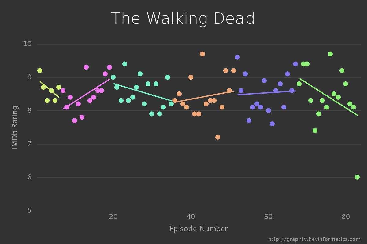 The Walking Dead perplexes critics because it’s caught between pulp and prestige. From season to season and showrunner to showrunner, it lurches between being worthy of flattery and being little more than a breeding ground for GIFs of gory walker kills and rants about characters’ dumb decisions. Wu’s data supports The Walking Dead’s reputation for inconsistency. Of 20 popular shows with a similar number of episodes in the IMDb database, only Arrow and Dexter have a higher standard deviation in episode rating (i.e., variation from the average rating) than The Walking Dead’s 0.6. (The shows with the most consistent quality — Curb Your Enthusiasm, Arrested Development, and The Sopranos — have standard deviations lower than 0.3.) And The Walking Dead’s trend is toward more fluctuation, with its sixth season showing the most mercurial user ratings of any season in the 20-show sample aside from Dexter’s much-maligned final season.