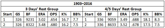 With those distinct samples separated, we can compare like to like: the three days’ rest guys in their first and second starts in the series, and the four- and five-days’ rest guys in their first and second starts in the series.