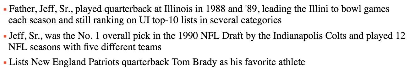 Yes, Jeff George Jr. is Illinois’s starting QB. I think this makes me feel particularly old because Jeff George Sr. kept playing for quite a long time — his last appearance on an NFL roster was in 2006, 16 years after he left Illinois.