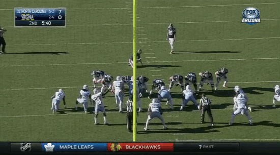 Butts is a tight end, but after some pre-snap movement, he ended up as the snapper on this play. He lateraled to Matt Johns, who serves as Virginia’s holder but used to be its starting QB. North Carolina’s defense promptly ignored Butts — BUTTS!!!! — and he waltzed into the end zone for the easiest touchdown throw of Johns’s career.