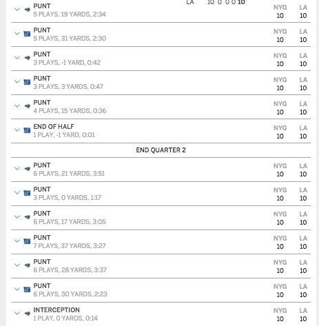 Luckily, Case Keenum was there in New York’s time of need. He threw four picks, including one on each of the Rams’ final three drives. One was returned for a TD, one set the Giants up in great field position to score their other TD, and his last was the decisive play of the game. He threw the ball up to a receiver who wasn’t there: