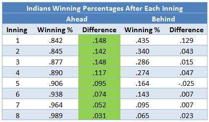 The Indians are really, really good when they get a lead. When they’ve gone ahead in the first inning, they’ve won at the pace of a 136-win team, and they’ve only improved the later their leads have lasted. The Indians aren’t bad when they’re behind, either; they’ve been better than the typical team when trailing after every inning except the fifth. In every case, though, the difference between the Indians’ winning percentage and the league’s is smaller when the Indians are losing. Relative to the rest of the league, the Indians have been much better at holding leads than they have at regaining them.