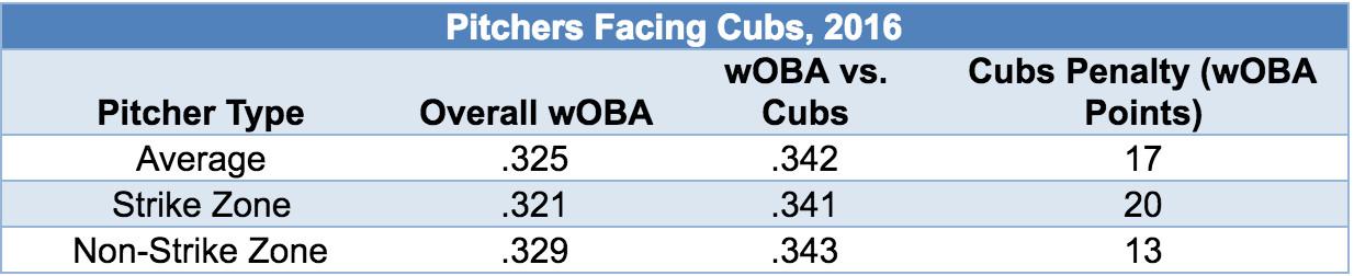 That’s the theory, anyway. It sounds great, except that the stats don’t support it. I looked up all the pitchers who faced the Cubs during the regular season, and I compared their weighted on-base average allowed (a stat on the OBP scale that encompasses the sum of a hitter’s performance) against all teams to their wOBA allowed against the Cubs, with both figures weighted by batters faced. The numbers are below.