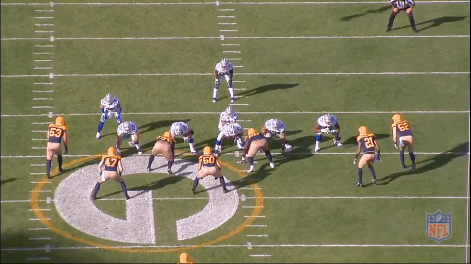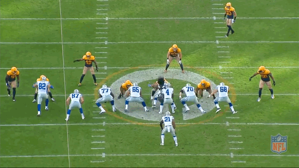 Take, for example, this first-and-10 play from the first quarter of the Cowboys’ 30–16 win over the Packers on October 16. Dallas sets up at its own 46-yard line, and receiver Lucky Whitehead goes in motion before the snap, eventually carrying out a fake end around. The threat of Whitehead tearing off the edge holds outside linebacker Clay Matthews in place, which leaves one less body for the Cowboys’ blockers to worry about. With Green Bay outmanned, it’s game over.