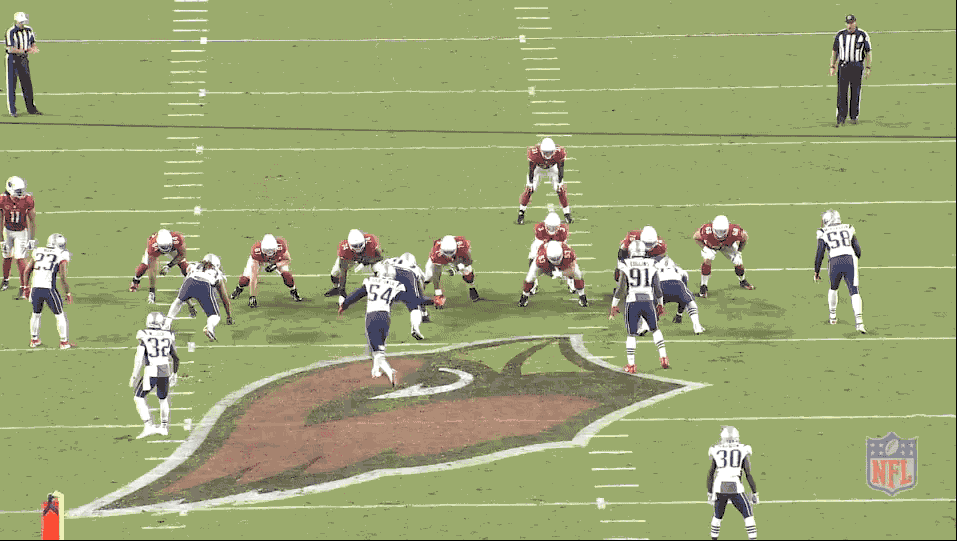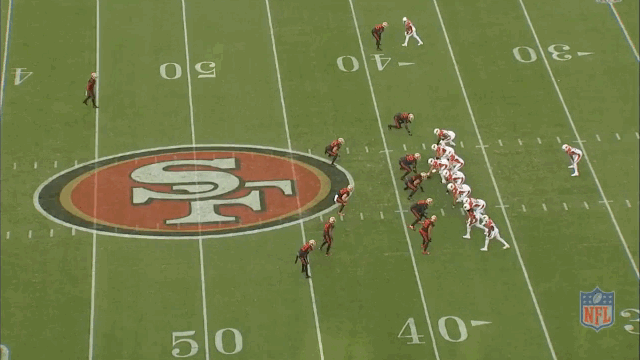 This is a first-and-10 run from the first quarter of Arizona’s 33–21 win over San Francisco on October 6. The two jump cuts he uses to get going are impressive, but the insane part is what happens next. When Johnson’s left foot hits the ground on the second cut, it’s almost like he teleports 6 yards.