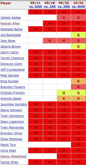 Look at that. This graphic (from Pro Football Reference’s extremely useful injury report page) is scarier than any horror movie that will be released this month. Chargers are dropping so fast that it’s almost impossible to keep up. The carnage in that list doesn’t even include Pro Bowl cornerback Jason Verrett, who this week simply told reporters, “My season is done,” when asked about his prognosis after being diagnosed with a partially torn ACL in his left knee.