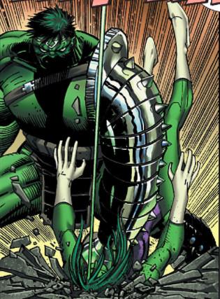 Reeling from the events of the superhero civil war and the devastating, near-world-destroying rampage of a supremely pissed-off Hulk (more on this later), the Marvel Universe was brought lower still by an invasion of the shape-shifting alien race known as the Skrulls. Owing to their ability to restructure their bodies at the molecular level, Skrulls are impossible to detect without specialized equipment owned by the Fantastic Four’s Reed Richards. Over an unknown amount of years, Skrulls infiltrated key positions within the government and replaced several superheros with doppelgängers. When the time was right, they attacked. Earth’s heroes fought them off, but at a huge cost.