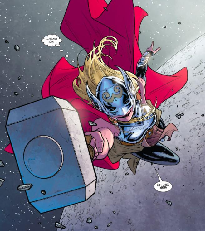 Thor’s longtime on-again-off-again love interest Jane Foster, who had been staying in Asgard while battling cancer, grasps Mjolnir, hefts, and, what do you know? Says right there on the side of the hammer: “Whosoever holds this hammer, if he be worthy, shall possess the power of Thor.” No reason that “he” can’t be a “she.”