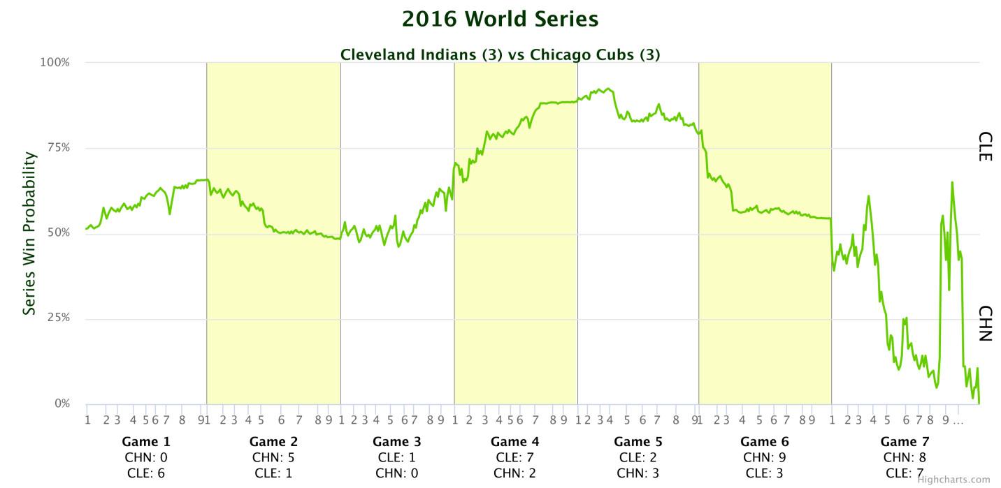 This was the October when relievers evolved, as Terry Francona stretched and prodded his pen into a weapon that could compensate for a short-handed rotation — and, in the process, pressured his peers to adapt. All month, we wondered whether Miller and Chapman would crack under the late-season load; Game 7 gave us our answer. Miller, who’d perplexingly worked with a six-run lead in Game 4, looked mortal, and Chapman, whom Joe Maddon had even more oddly deployed in an all-but-over Game 6, was reduced to slinging sliders and hitting triple digits just once. The postseason started with one manager not using his best reliever; it nearly ended with two more managers using their best relievers too much. If November was the wall, though, the Cubs broke through it, with Maddon bailed out by his Tampa Bay brother Ben Zobrist, whose 10th-inning RBI double was, by championship win probability added, the 16th-biggest hit in World Series history — well behind Rajai Davis’s dinger, which ranks fourth.