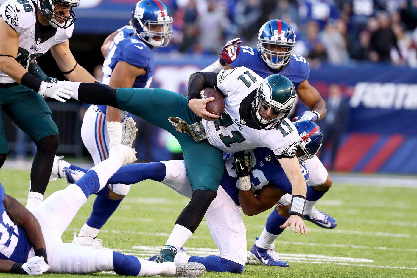 That type of result was a fixture in Sunday’s games, most notably in the Eagles’ 28–23 loss to the Giants. On the opening play of the second quarter, Philadelphia faced a fourth-and-2 from the New York 23-yard line. Quarterback Carson Wentz faked a handoff before getting dropped 4 yards deep in the backfield. Watching it was like seeing a car wreck in slow motion; I don’t want to get carried away, but it’s a serious contender for the worst call any coach has made all season.